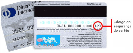 O código de segurança do cartão DINERS está localizado no verso do cartão e corresponde aos quatro últimos dígitos da faixa numérica.